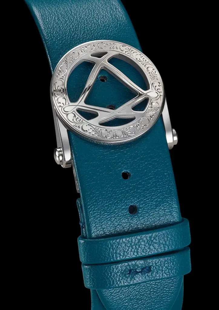 ブランドのダブル「L」ロゴを配したラウンド型オープンワークフォールディングバックル(18Kパラジウムホワイトゴールド/手彫り)
